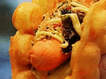 A melting pot of delicious orange pumpkin chai goodness baked into a bubble waffle cone with a juicy hot dog of perfection.